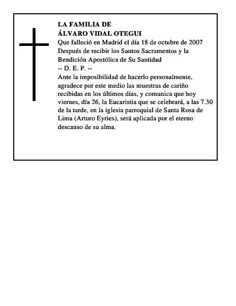 LA FAMILIA DEÁLVARO VIDAL OTEGUIQue falleció en Madrid el día 18 de octubre de 2007Después de recibir los Santos Sacramentos y la Bendición Apostólica de Su Santidad-- D.E.P. --Ante la imposibilidad de hacerlo personalmente, agradece por este medio las muestras de cariño recibidas en los últimos días, y comunica que hoy viernes, día 26, la Eucaristia que se celebrará, a las 7.30 de la tarde, en la iglesia parroquial de Santa Rosa de Lima (Arturo Eyries), será aplicada por el eterno descanso de su alma.