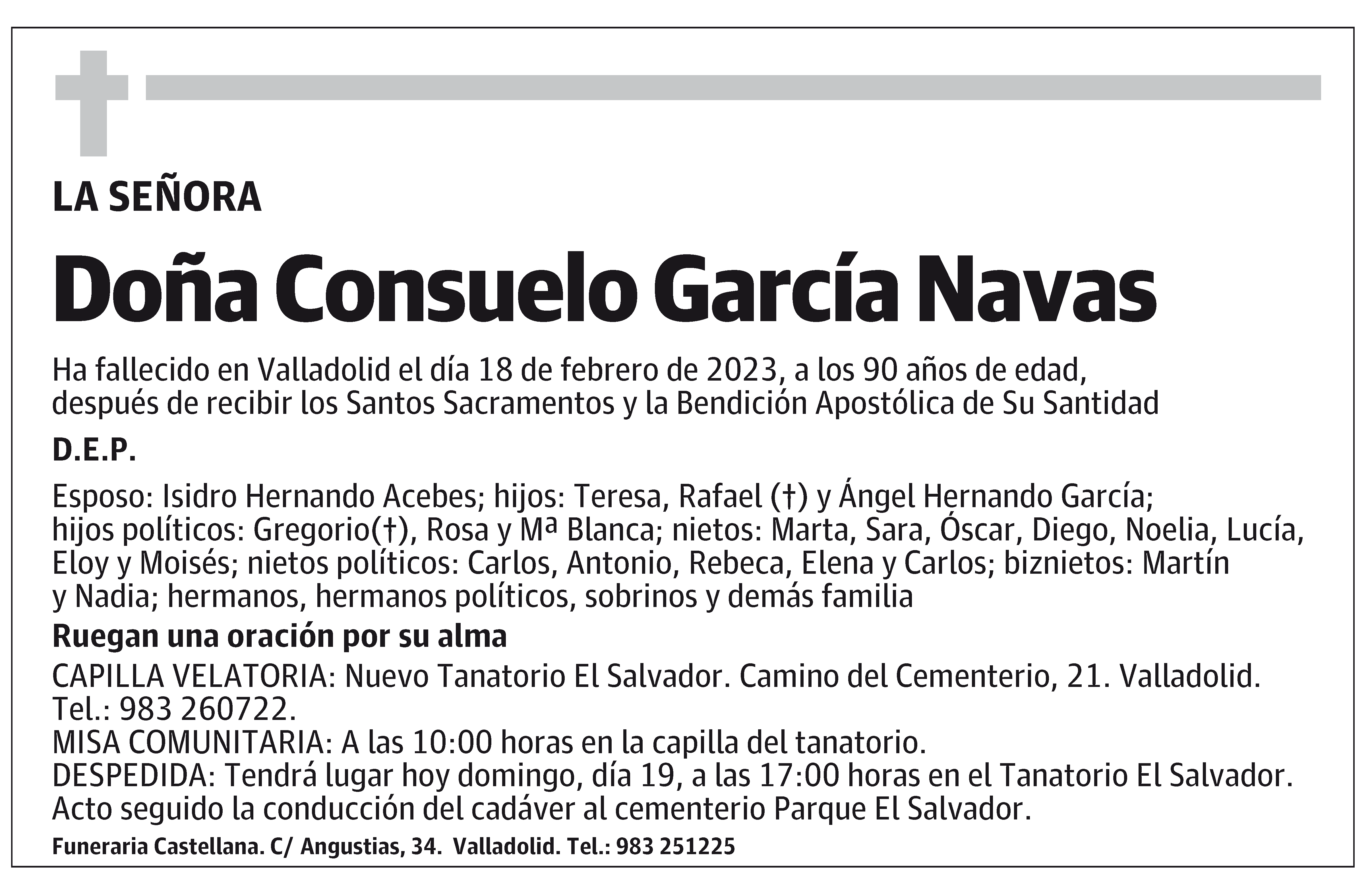Esposo: Isidro Hernando Acebes; hijos: Teresa, Rafael (†) y Ángel Hernando García; hijos políticos: Gregorio(†), Rosa y Mª Blanca; nietos: Marta, Sara, Óscar, Diego, Noelia, Lucía, Eloy y Moisés; nietos políticos: Carlos, Antonio, Rebeca, Elena y Carlos; biznietos: Martín y Nadia; hermanos, hermanos políticos, sobrinos y demás familia