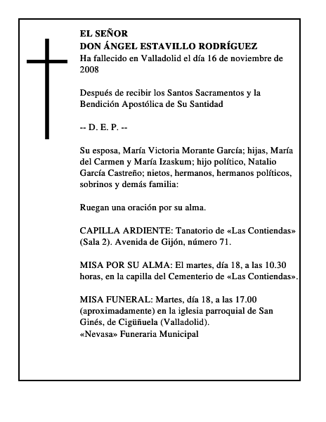 EL SEÑORDON ÁNGEL ESTAVILLO RODRÍGUEZHa fallecido en Valladolid el día 16 de noviembre de 2008Después de recibir los Santos Sacramentos y la Bendición Apostólica de Su Santidad-- D.E.P. --Su esposa, María Victoria Morante García; hijas, María del Carmen y María Izaskum; hijo político, Natalio García Castreño; nietos, hermanos, hermanos políticos, sobrinos y demás familia:Ruegan una oración por su alma.