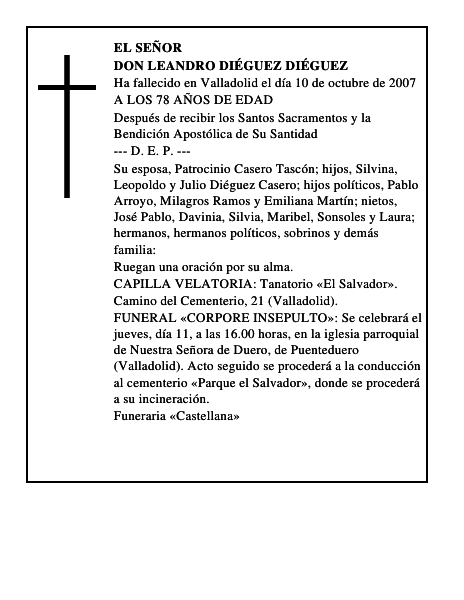 EL SEÑORDON LEANDRO DIÉGUEZ DIÉGUEZHa fallecido en Valladolid el día 10 de octubre de 2007A LOS 78 AÑOS DE EDADDespués de recibir los Santos Sacramentos y la Bendición Apostólica de Su Santidad--- D.E.P. ---Su esposa, Patrocinio Casero Tascón; hijos, Silvina, Leopoldo y Julio Diéguez Casero; hijos políticos, Pablo Arroyo, Milagros Ramos y Emiliana Martín; nietos, José Pablo, Davinia, Silvia, Maribel, Sonsoles y Laura; hermanos, hermanos políticos, sobrinos y demás familia:Ruegan una oración por su alma.