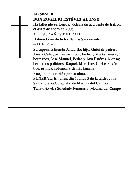 EL SEÑORDON ROGELIO ESTÉVEZ ALONSOHa fallecido en Lérida, víctima de accidente de tráfico, el día 5 de enero de 2008A LOS 32 AÑOS DE EDADHabiendo recibido los Santos Sacramentos-- D.E.P. --Su esposa, Elisenda Astudillo; hijo, Gabriel; padres, José y Celia; padres políticos, Pedro y María Teresa; hermanos, José Manuel, Pedro y Ana Estévez Alonso; hermanos políticos, Raquel, Mari Luz, Carlos e Iván; tíos, primos, sobrinos y demás familia:Ruegan una oración por su alma.