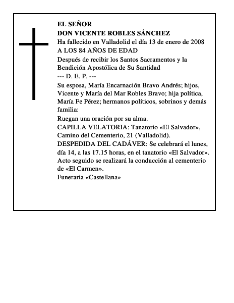 EL SEÑORDON VICENTE ROBLES SÁNCHEZHa fallecido en Valladolid el día 13 de enero de 2008A LOS 84 AÑOS DE EDADDespués de recibir los Santos Sacramentos y la Bendición Apostólica de Su Santidad--- D.E.P. ---Su esposa, María Encarnación Bravo Andrés; hijos, Vicente y María del Mar Robles Bravo; hija política, María Fe Pérez; hermanos políticos, sobrinos y demás familia:Ruegan una oración por su alma.