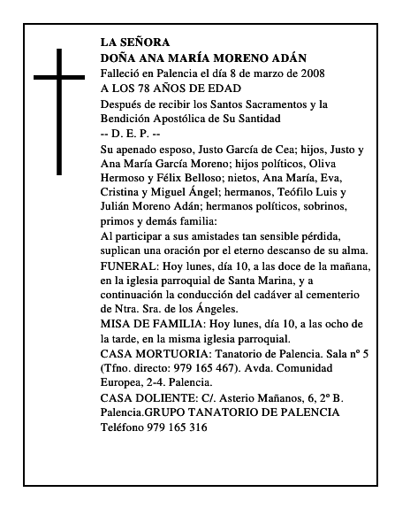 LA SEÑORADOÑA ANA MARÍA MORENO ADÁNFalleció en Palencia el día 8 de marzo de 2008A LOS 78 AÑOS DE EDADDespués de recibir los Santos Sacramentos y la Bendición Apostólica de Su Santidad-- D.E.P. --Su apenado esposo, Justo García de Cea; hijos, Justo y Ana María García Moreno; hijos políticos, Oliva Hermoso y Félix Belloso; nietos, Ana María, Eva, Cristina y Miguel Ángel; hermanos, Teófilo Luis y Julián Moreno Adán; hermanos políticos, sobrinos, primos y demás familia:Al participar a sus amistades tan sensible pérdida, suplican una oración por el eterno descanso de su alma.