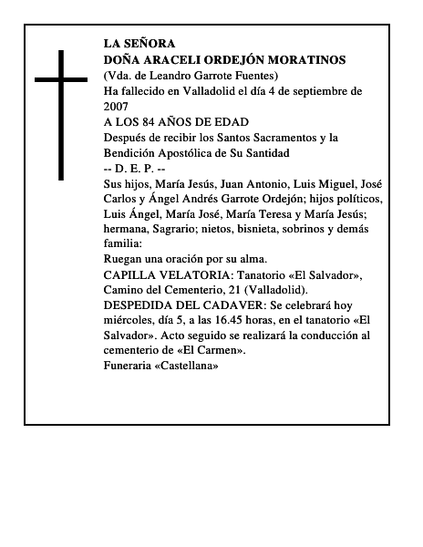 LA SEÑORADOÑA ARACELI ORDEJÓN MORATINOS(Vda. de Leandro Garrote Fuentes)Ha fallecido en Valladolid el día 4 de septiembre de 2007A LOS 84 AÑOS DE EDADDespués de recibir los Santos Sacramentos y la Bendición Apostólica de Su Santidad-- D.E.P. --Sus hijos, María Jesús, Juan Antonio, Luis Miguel, José Carlos y Ángel Andrés Garrote Ordejón; hijos políticos, Luis Ángel, María José, María Teresa y María Jesús; hermana, Sagrario; nietos, bisnieta, sobrinos y demás familia:Ruegan una oración por su alma.