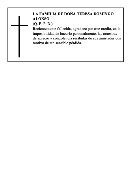 Recientemente fallecida, agradece por este medio, en la imposibilidad de hacerlo personalmente, las muestras de aprecio y condolencia recibidas de sus amistades con motivo de tan sensible pérdida.