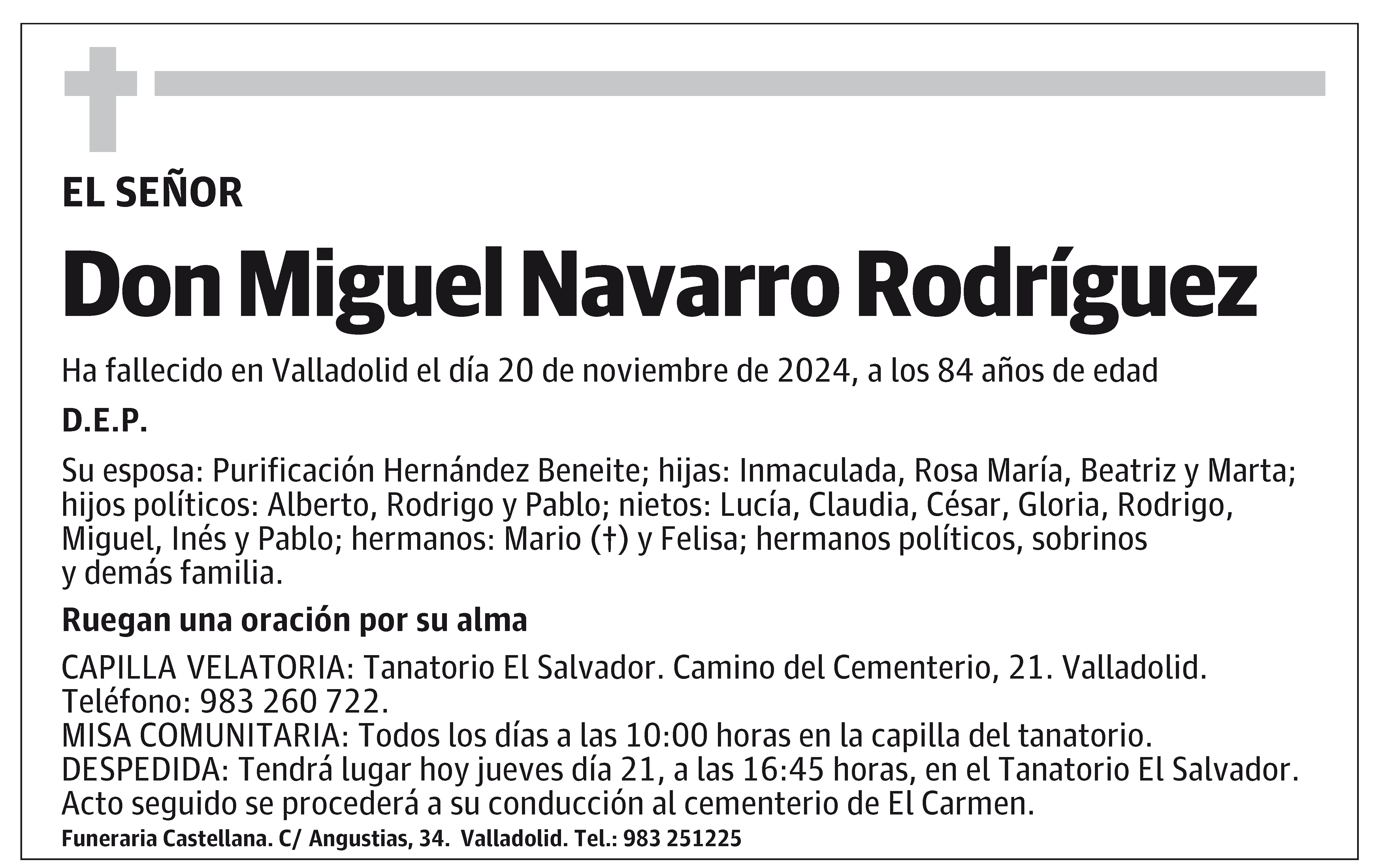 Ha fallecido en Valladolid el día 20 de noviembre de 2024, a los 84 años de edad