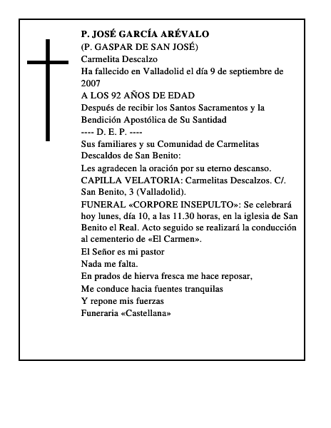 P. JOSÉ GARCÍA ARÉVALO(P. GASPAR DE SAN JOSÉ)Carmelita DescalzoHa fallecido en Valladolid el día 9 de septiembre de 2007A LOS 92 AÑOS DE EDADDespués de recibir los Santos Sacramentos y la Bendición Apostólica de Su Santidad---- D.E.P. ----Sus familiares y su Comunidad de Carmelitas Descaldos de San Benito:Les agradecen la oración por su eterno descanso.