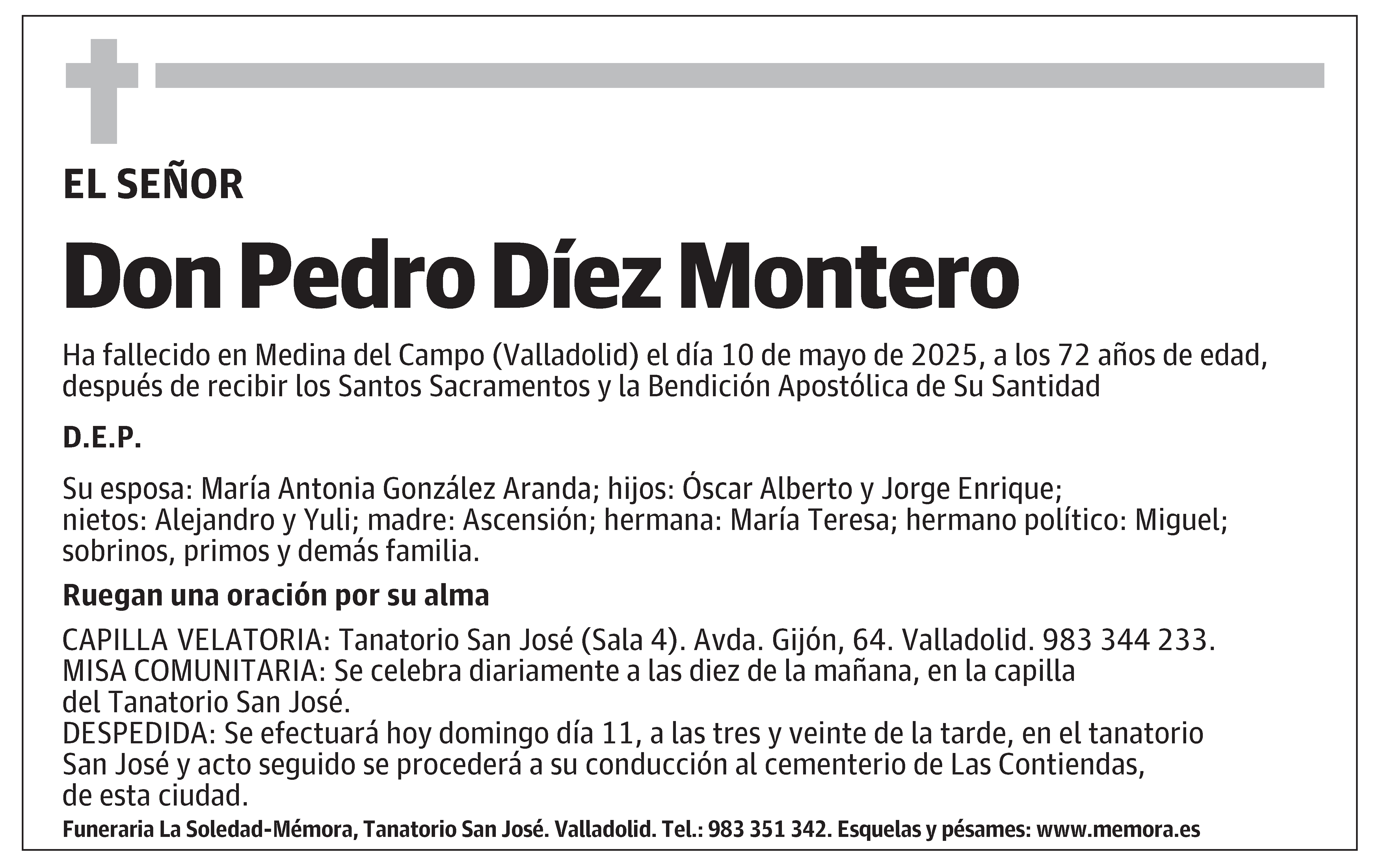 Funeraria La Soledad-Mémora, Tanatorio San José. Valladolid. Tel.: 983 351 342. Esquelas y pésames: www.memora.es