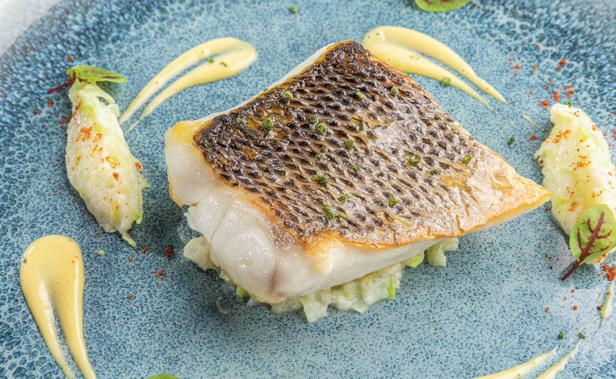 Colocamos el tártaro de vieiras en el fondo de unos platos y acompañamos con la capuchina caliente. El contraste frío-caliente es extraordinario.